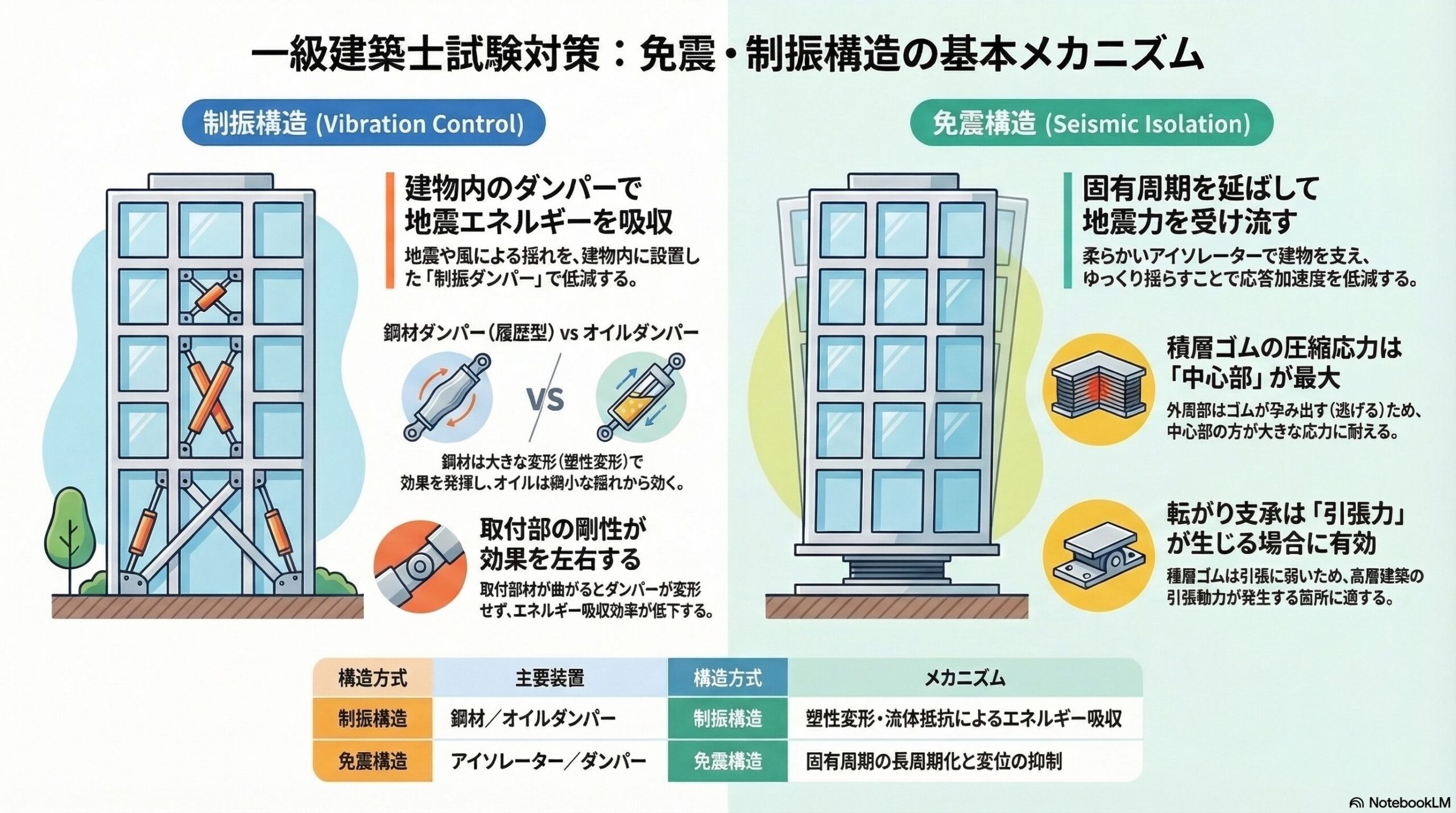 - 免震は「周期を長くして力を減らす」、制振は「ダンパーを変形させてエネルギーを吸収する」
